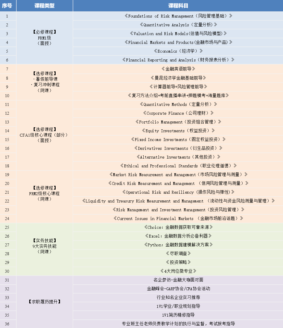 1、课程设置涵盖了FRM金融风险管理师考纲全部课程,兼顾引入了CFA特许金融分析师1级部分核心课程内容;此外,还开设金融英语前导课、风险管理前导课以及金融计算器使用方法前导课帮助同学们夯实基础;