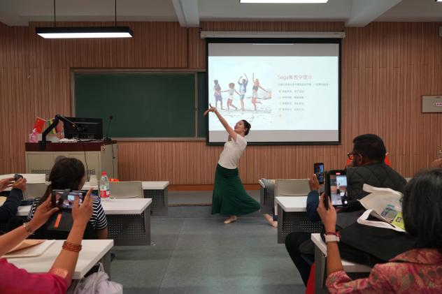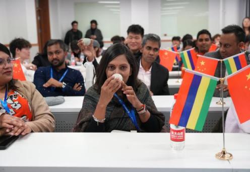 活动中,“击鼓传花”破冰环节率先点燃气氛,话筒传递间,手持者用英语自我介绍,快速拉近彼此距离。核心环节“沉浸式文化探索工作坊”中,多个特色文化站点开放,各小组依次体验,沉浸式感受两国文化魅力。汉字书法站点里,崔明润、刘健琨、隋金昊三名同学耐心讲解汉字笔画美学与“福”、“友”等字的美好寓意,为毛里求斯嘉宾定制中文名字并指导书写;中国茶艺体验站点内,吴俊毅同学细致演示绿茶、乌龙茶冲泡技艺,分享茶道精神,毛里求斯嘉宾驻足观色、闻香、品茗,还热情交流当地红茶文化;毛里求斯文化专区更是热闹非凡,嘉宾分享地理历史民俗知识,带领大家跳起传统Sega舞,将现场气氛推向高潮。此外,彭子函、陈力扬同学的民族舞蹈与笛子独奏,尽显中华传统文化韵味,获嘉宾一致好评。