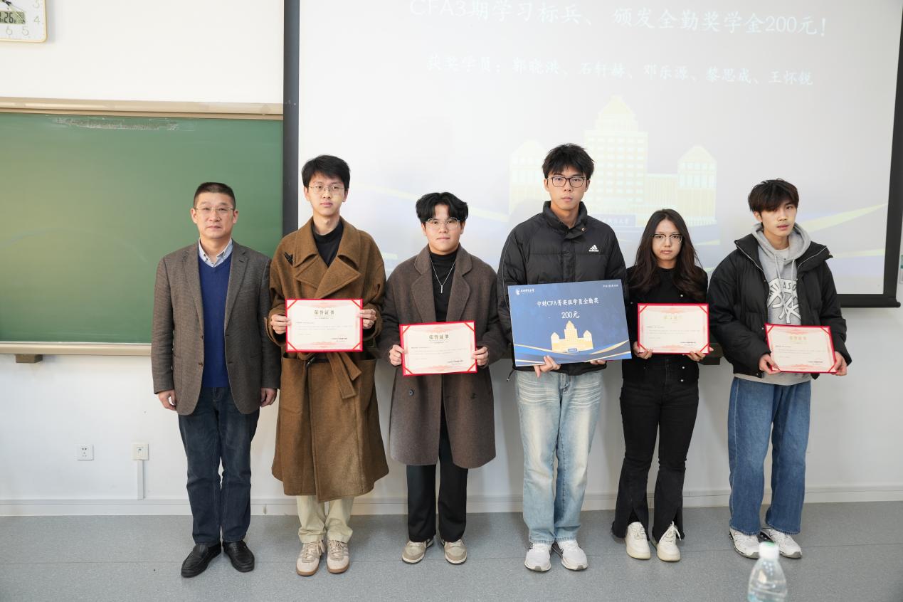 蔡如海院长为在中财大CFA菁英班(第3期)学习期间学习勤奋、纪律严明,实现全勤参与且学风优良者,授予“班级学习标兵”称号,颁发全勤奖学金。