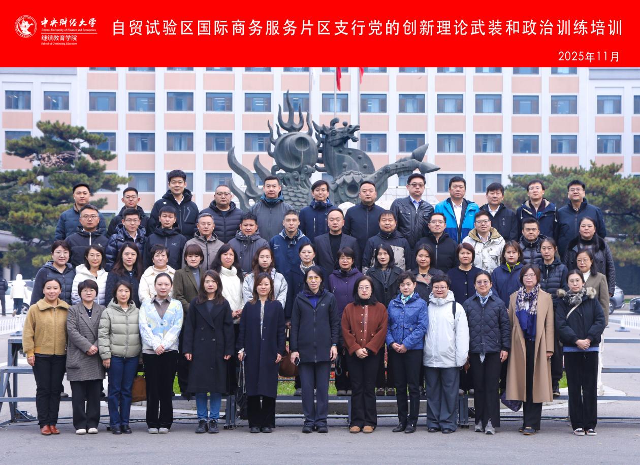 2025年11月5日,由中央财经大学继续教育学院举办的“自贸试验区国际商务服务片区支行党的创新理论武装和政治训练培训”在我校圆满完成。中国工商银行股份有限公司北京自贸试验区国际商务服务片区支行党支部书记、组织委员及科级管理人员等65位学员参训。