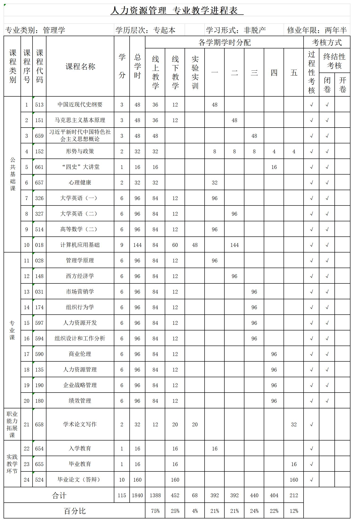 专科起点升本科人力资源管理专业培养方案